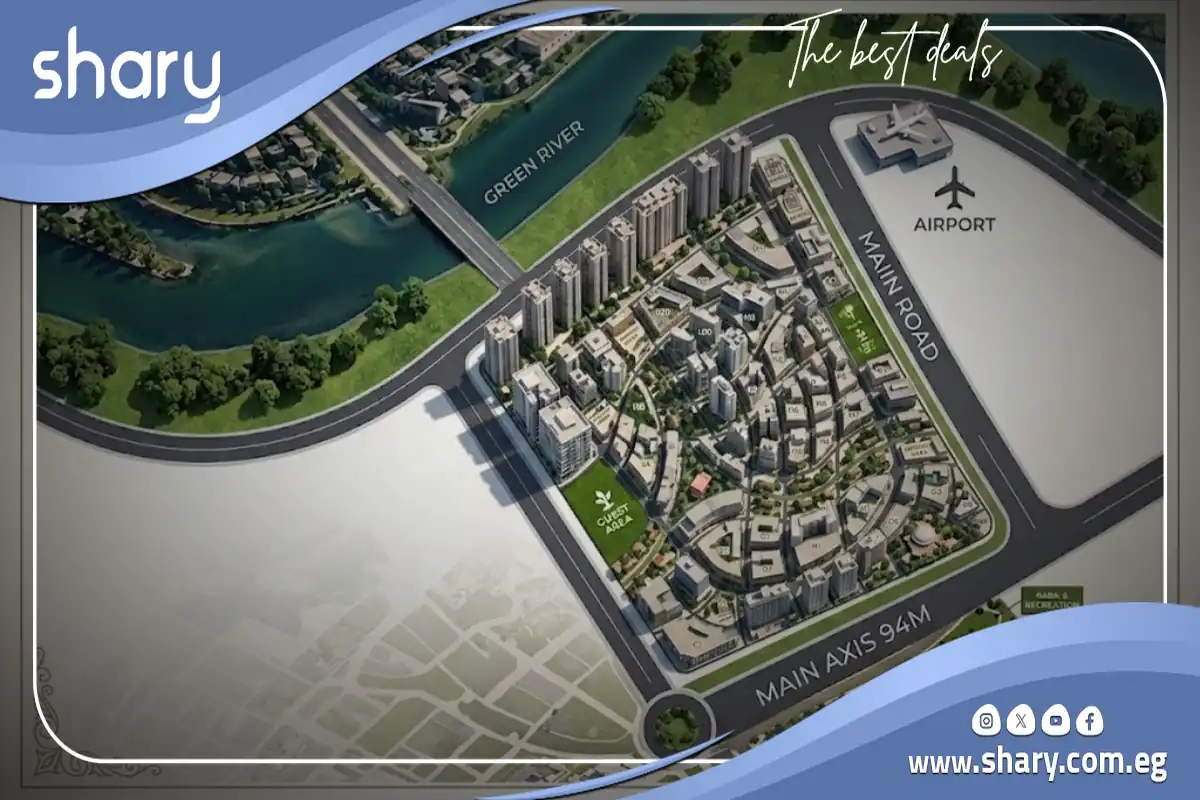 Ayyam Residence New Capital Compound is located in the eighth residential district R8, specifically within plot D3, with most of its units directly overlooking the attractive Green River, and close to all main axes and vital areas, thus occupying an ideal location for clients and investors.