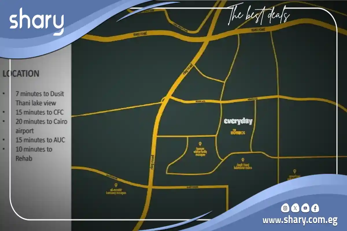 Everyday Mall is ideally located in the heart of Al Yasmeen District in Fifth Settlement, close to the area’s most important roads and key landmarks. The project sits just 15 minutes from the American University in Cairo and approximately 20 minutes from Cairo International Airport, making it a highly accessible destination for business and investment.