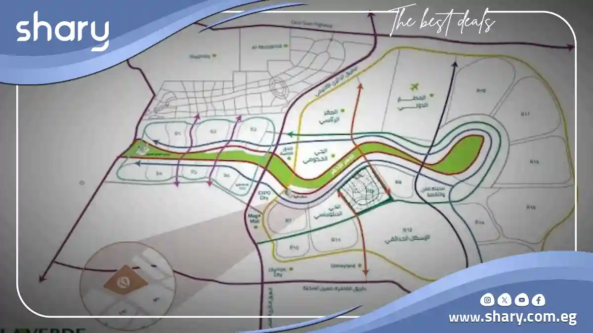 The location of La Verde Cassette is set in a prime area within the R8 residential district, Block K1, overlooking Bin Zayed Axis and neighboring Anakahji New Capital. It is only a short distance from the school complex, the diplomatic district, and the Green River, while being just 15 minutes away from the New Capital International Airport.