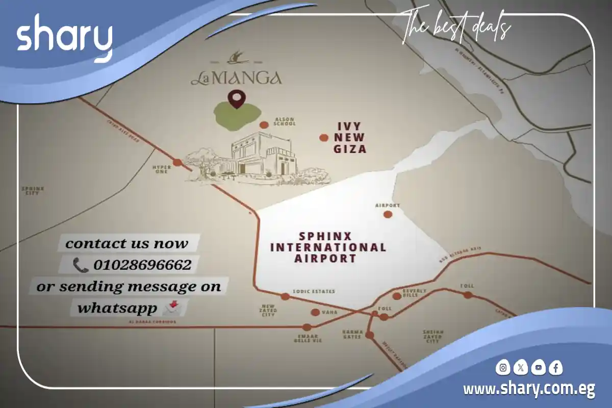 - 26th of July Axis: Reach Lamanga Sphinx Compound in about 10 minutes via this axis, ensuring quick access to Cairo and Sheikh Zayed.