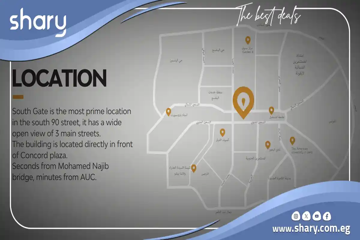 Mall South Gate Fifth Settlement is strategically located on South 90th Street, near PetroGas Company, with close proximity to Mohamed Naguib Axis and the Ring Road. It is also near the American University, adjacent to residential compounds and medical centers.