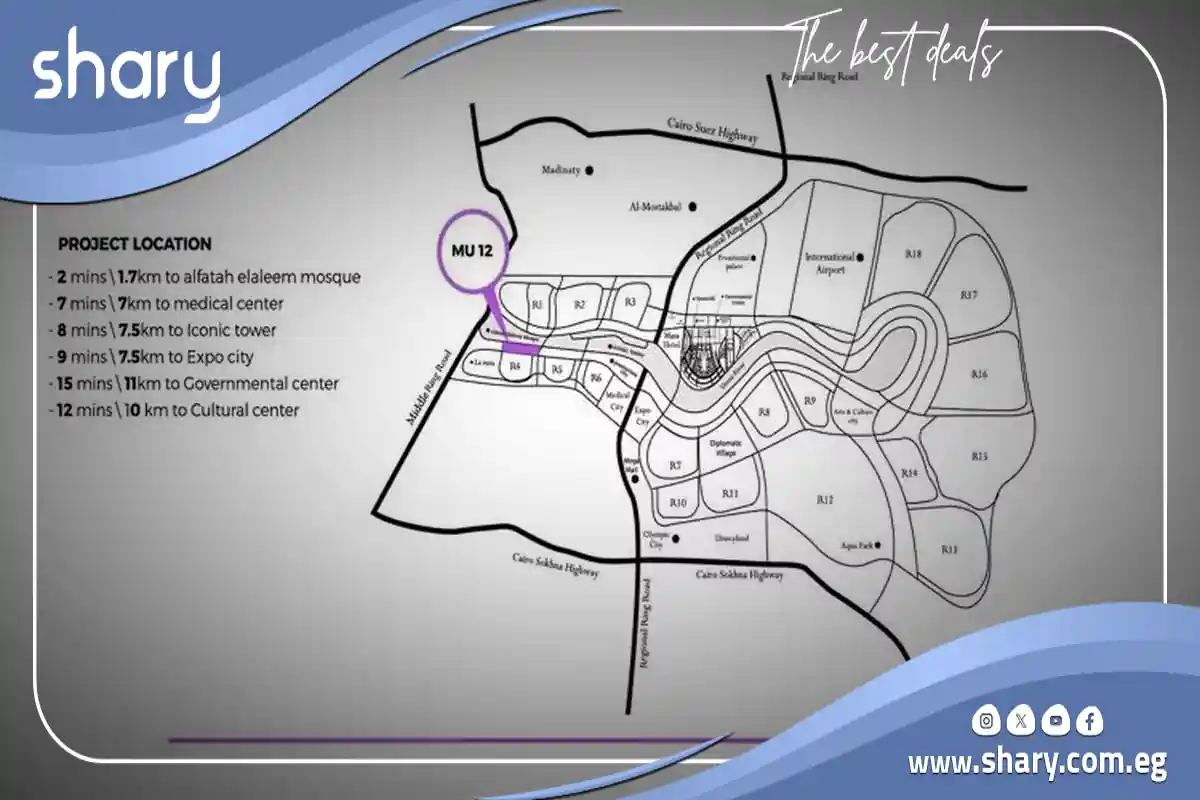 Matter Makers Mall New Capital is located in the heart of MU12 area in front of R4 and R5, just minutes away from Al-Fattah Al-Alim Mosque, the Government District, and the Middle Ring Road.