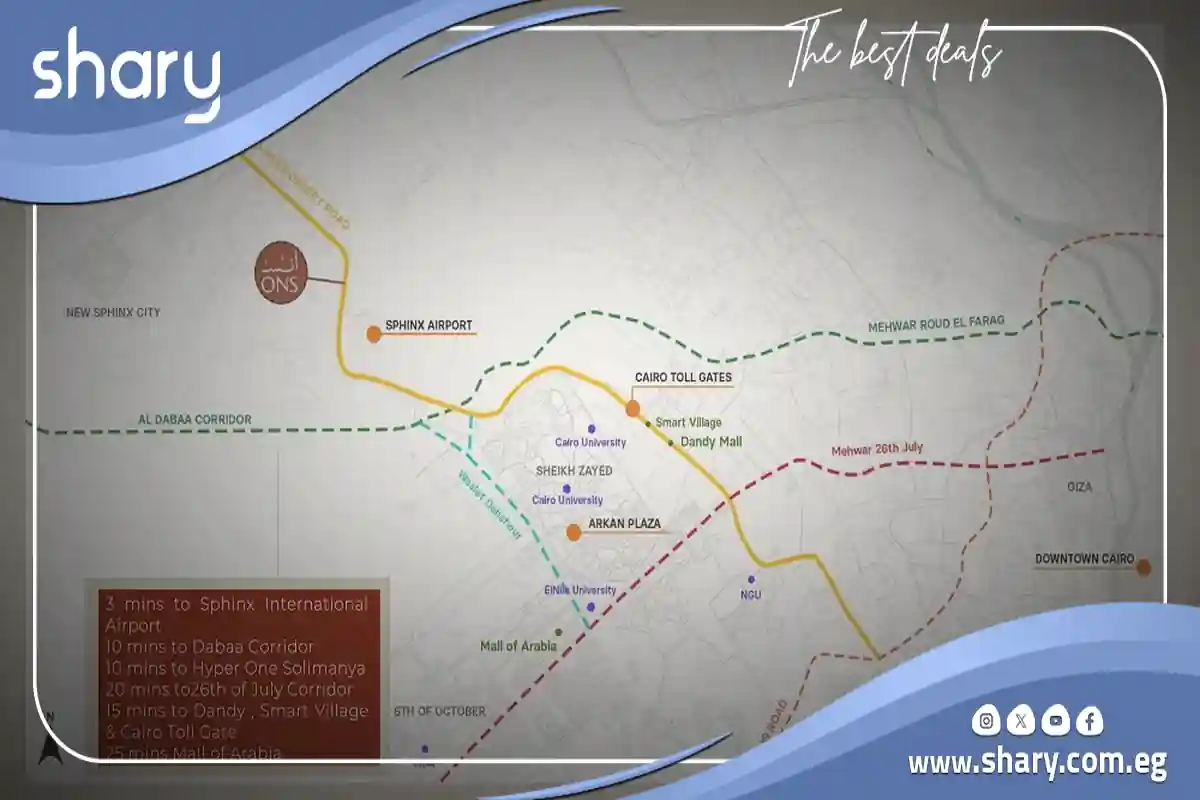 - Dabaa Axis: ONS Zayed Project is just 10 minutes away from the Dabaa Axis, which facilitates access to the northern and western regions of Egypt.