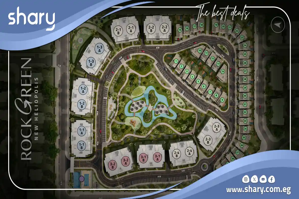 - Rock Green New Heliopolis Compound is located in a prime area close to major roads and axes, as well as medical, educational, and commercial centers.