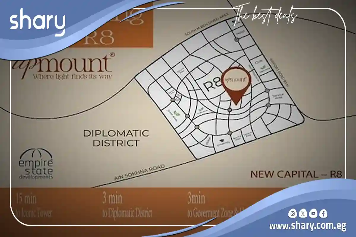 - Government District: Easily accessible from Upmount Project New Capital within just a few minutes.