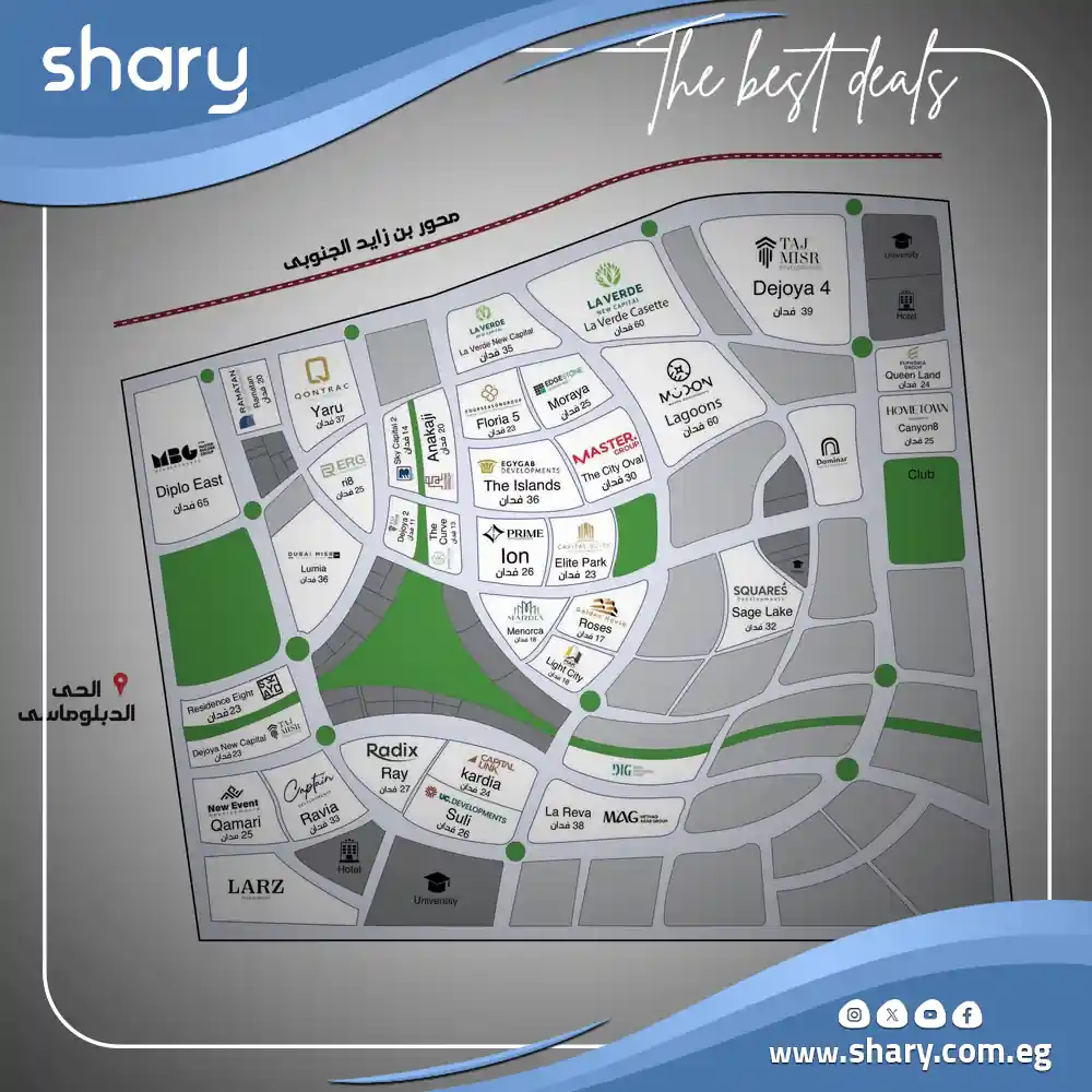 It is close to the Green River, the Government District, and the Diplomatic District — placing it at the heart of one of the most vibrant and elegant areas of the New Administrative Capital.
