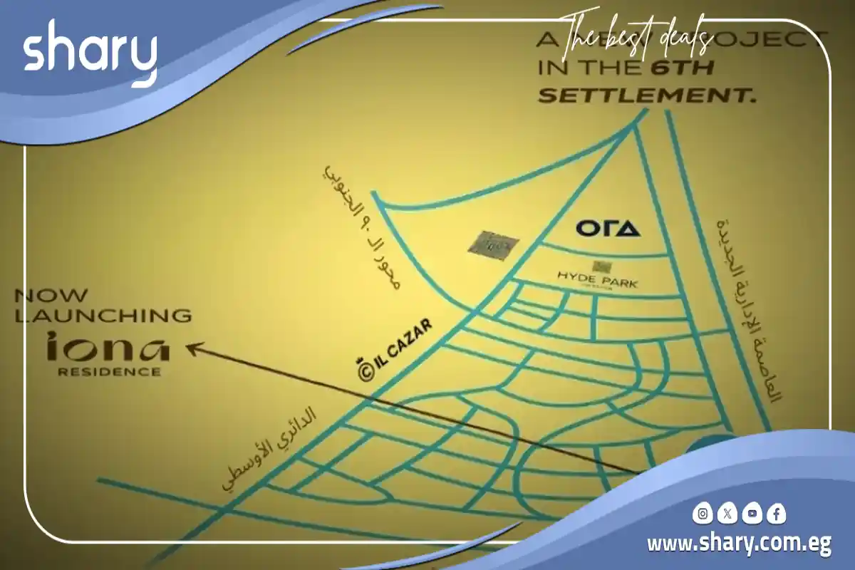 - Strategic location within Iona Residence New Cairo Sixth Settlement near main roads and essential services.