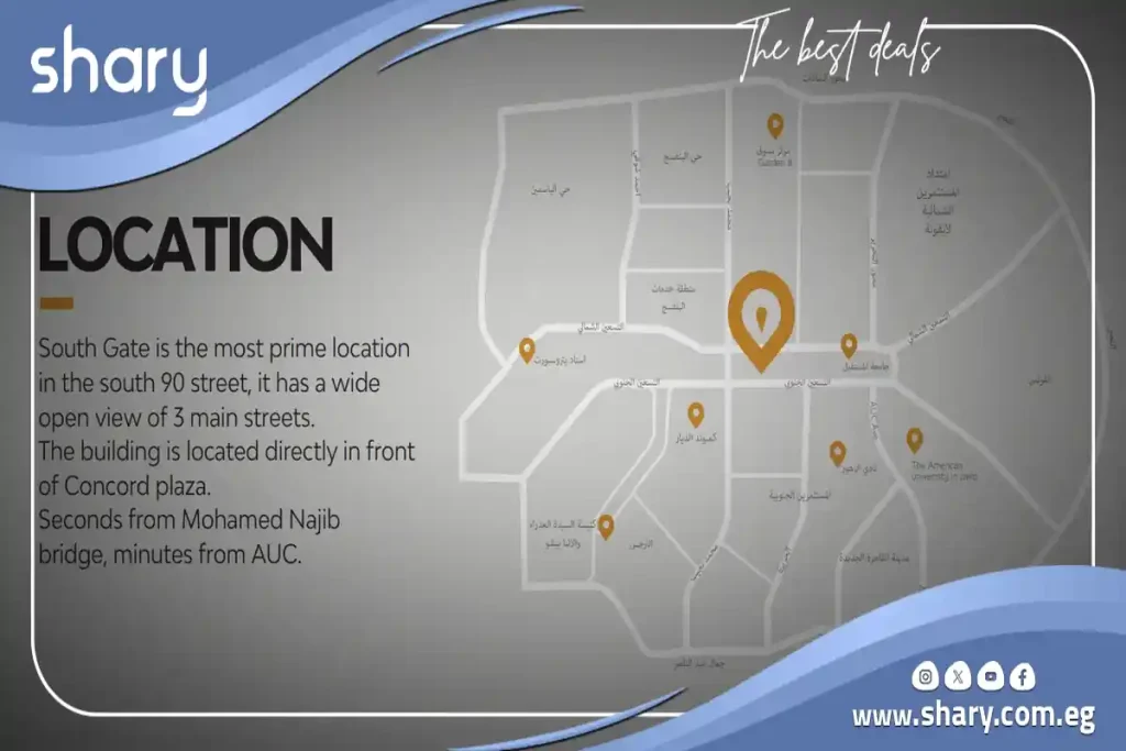 - يقع Mall South Gate New Cairo داخل موقع حيوي بالقرب من المرافق والخدمات والطرق والمحاور الرئيسية.