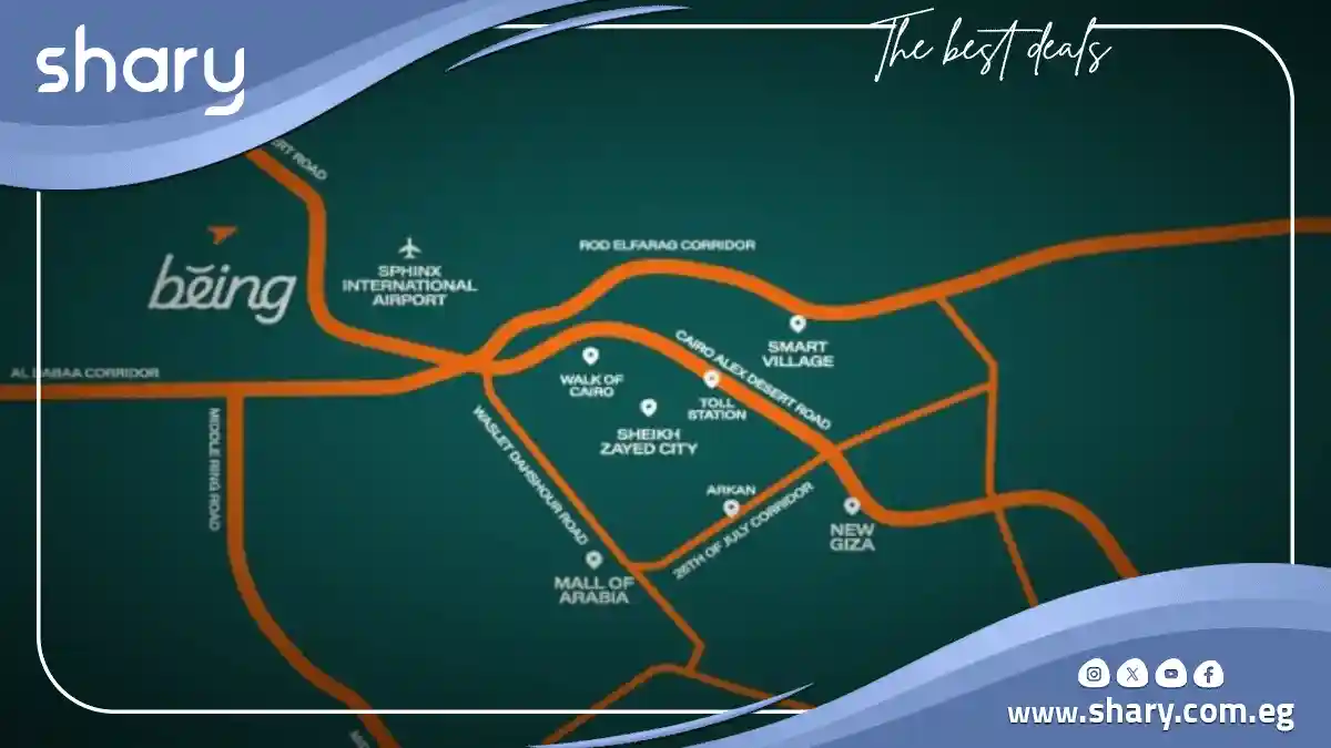 - محور محمد نجيب: يبعد كمبوند Being نيو زايد عن محور محمد نجيب بعدة دقائق.