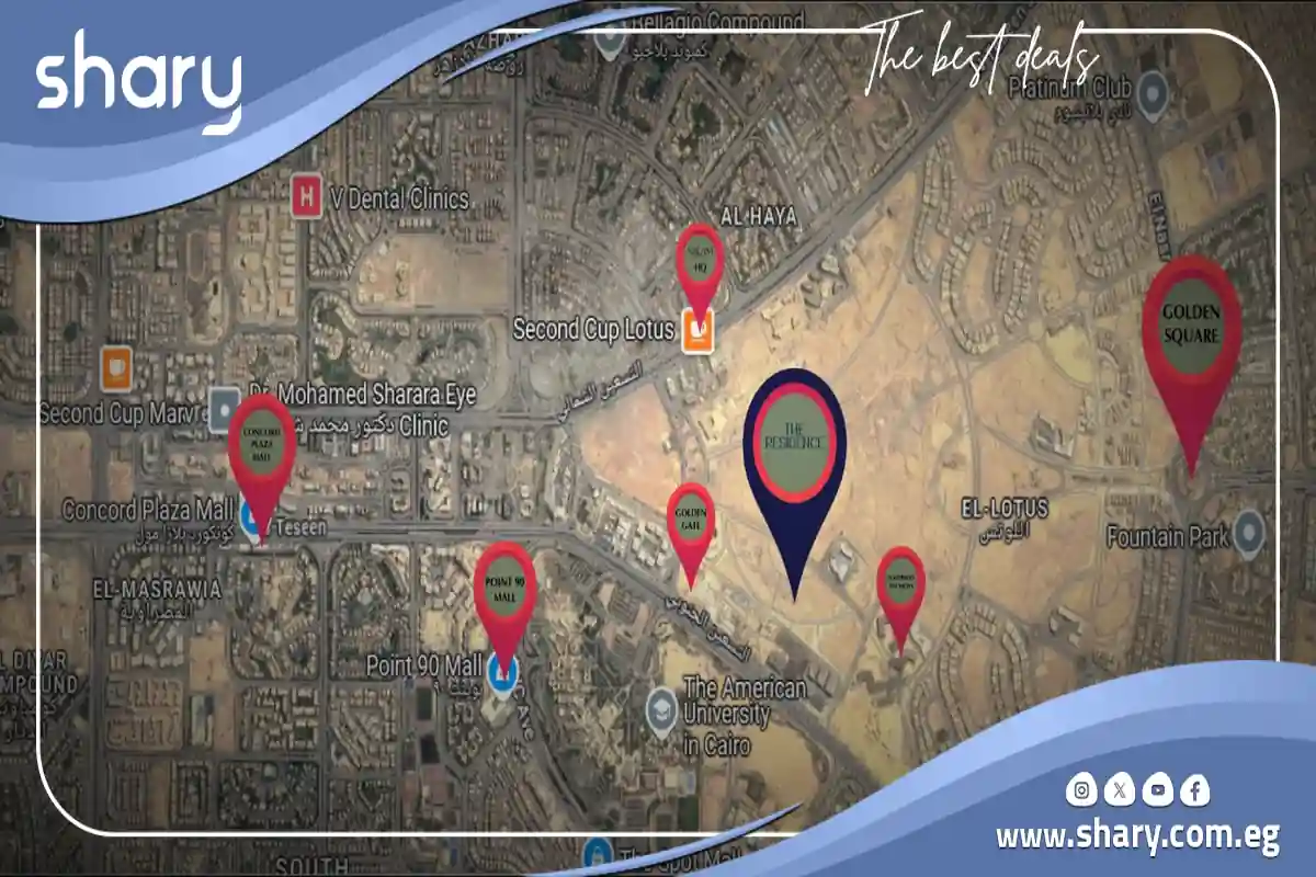 - حي اللوتس: يقع مشروع ذا ريزيدنس على بعد دقائق من حي اللوتس الذي يعتبر أشهر الأحياء السكنية بالقاهرة الجديدة.