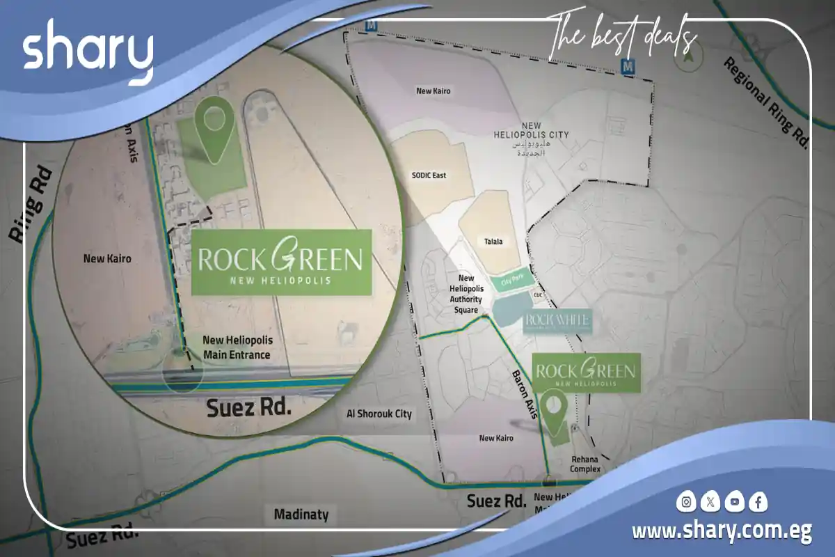 - يقع كمبوند روك جرين نيو هليوبوليس داخل موقع حيوي بالقرب من الطرق والمحاور والمراكز الطبية والتعليمة والتجارية.