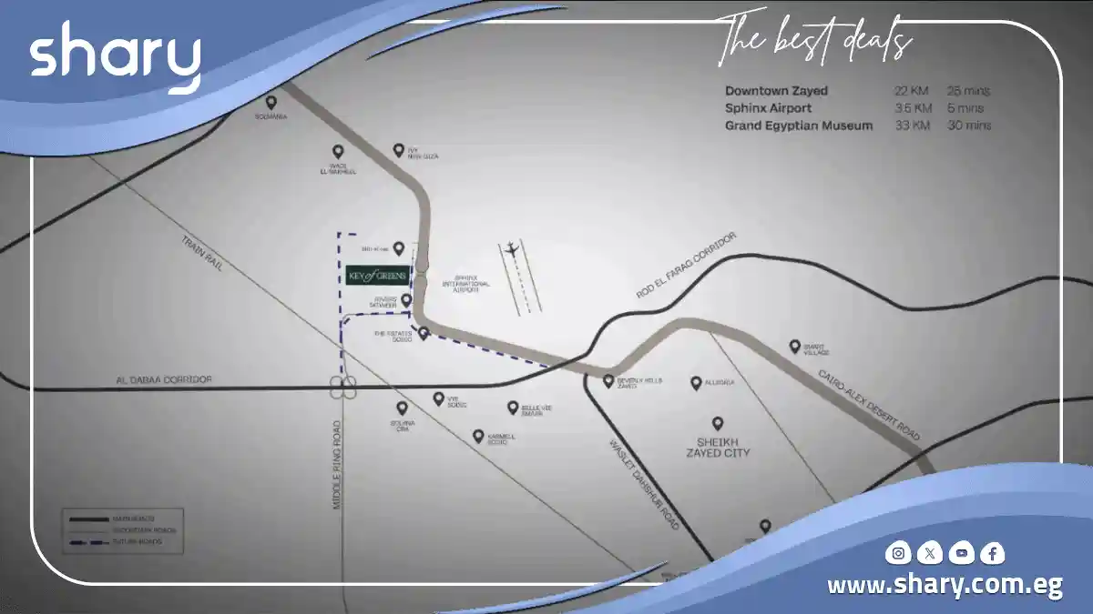 - طريق الواحات: يفصل مشروع Key Of Greens مسافة قصيرة من طريق الواحات.