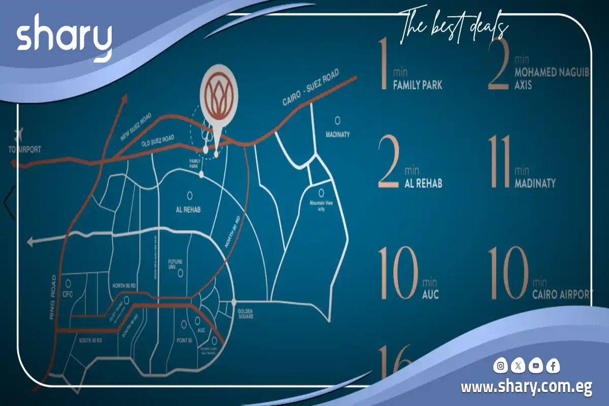 - موقع استراتيجي قريب من فاميلي بارك، مدينة الرحاب ومحور محمد نجيب، مطار القاهرة.