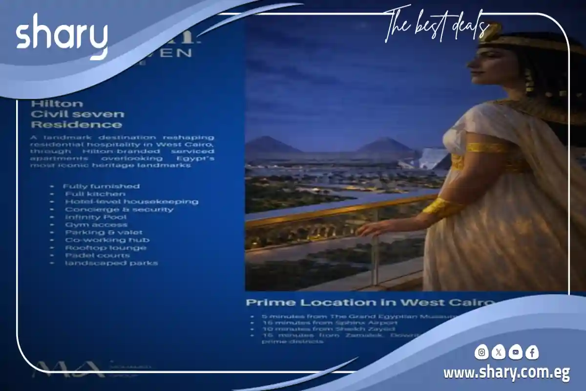 هيلتون سيفيل سيفن ريزيدنس اكتوبر Hilton Civil Seven October ثورة حقيقة في عالم الإقامة الفندقية والسكنية، أطلقتها شركة محمد أيوب جروب للتطوير العقاري، كخطوة جديدة تجتمع فيها الفخامة الفريدة مع الأسعار التنافسية.